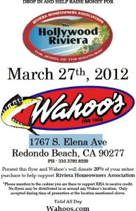 Get hungry on Tuesday, March 27, when Wahoo’s Fish Tacos will give the RHA 20% of the proceeds if you just say “I support the Riviera Homeowners Assoc.” You can give them this flyer, but the flyer is not necessary.