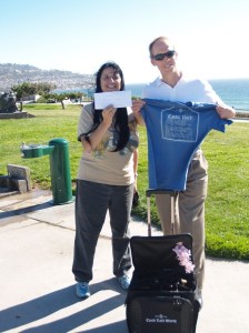 Karen Dahl of the Riviera–beach cruiser bicycle from Smith’s Cycle Shop, Ms. Mei of Rancho Palos Verdes (husband Mark Martin accepted the prize)–wine trolley cart and bottles of wine from Castle Rock Winery, Nancy Lucero of Harbor City–dinner and a movie at the AMC Rolling Hills Center, Nick Raleigh of Torrance (not shown) gift certificate from Wahoo’s Tacos in the Riviera Village.