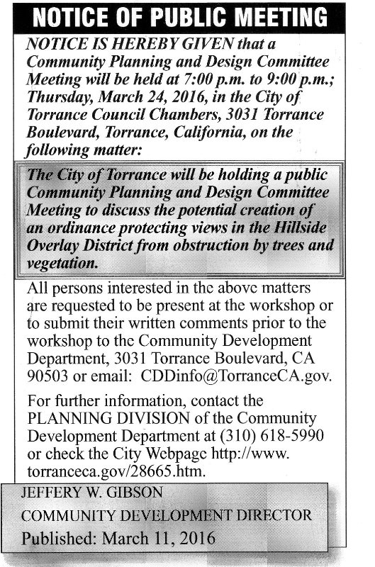 Notice for March 24 hearing on an ordinance to protect hillside views from obstruction by trees and vegetation