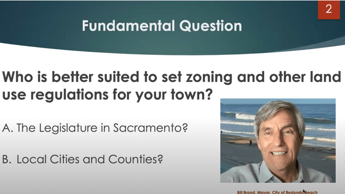 Our featured Guest on Wednesday, January 26 was Redondo Beach Mayor Bill Brand, co-author of a voter initiative, which would STOP SACRAMENTO from taking control of local zoning and overturn SB9 and SB10.