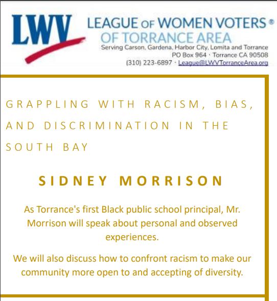 The City of Torrance is hosting the League of Women Voters South Bay Area’s Forum on “Grappling with Racism, Bias, and Discrimination” on Thursday, February 23, 2023 in the Toyota Meeting Hall, at the Torrance Cultural Arts Center. The event is free, but registration is required.