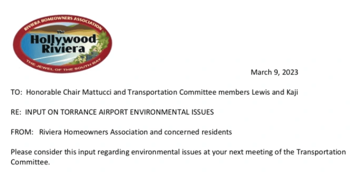 For more background on your RHA’s response to the noise and pollution problem from the Torrance Airport, please see our Torrance Airport Issues page