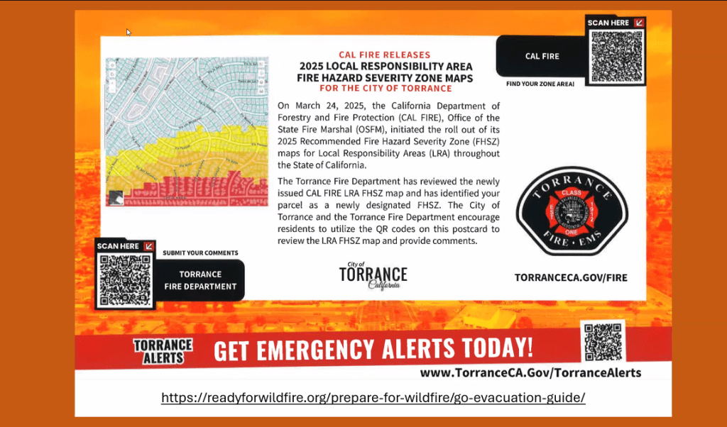 Daniel Singleton, Public Affairs/Education Fire Prevention with the Torrance Fire Department, advised that we are all first responders — be sure you know how to evacuate. Visit CalFire’s website — it’s a good resource for go-bags and other tips: https://readyforwildfire.org/prepare-for-wildfire/go-evacuation-guide/. His other advice included: