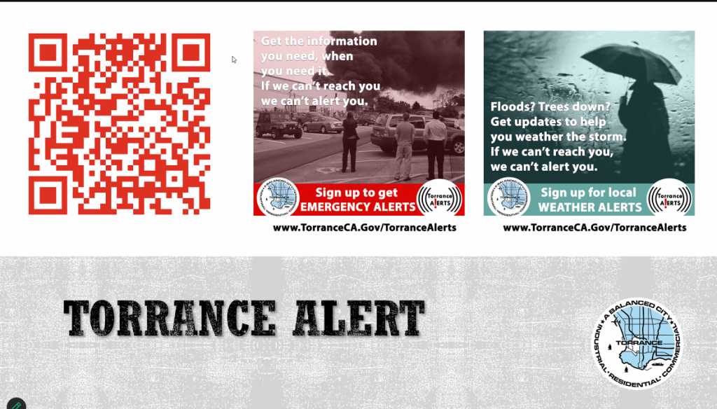 - Sign up at the QR code below or at https://www.TorranceCA.gov/torrancealerts