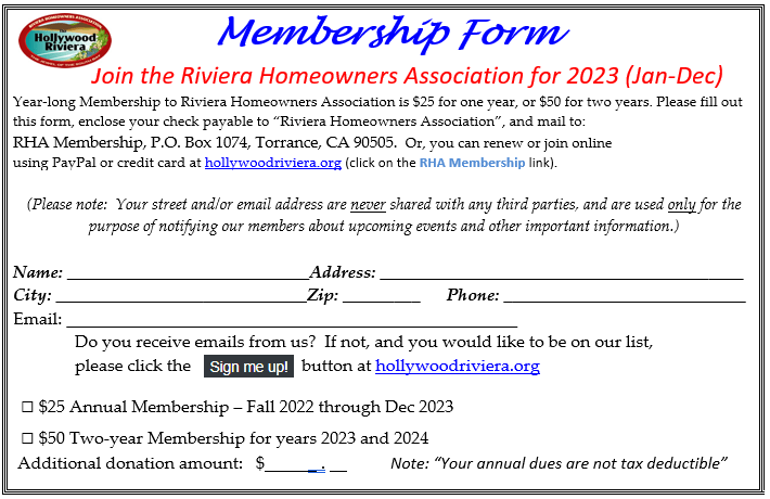 Please join with friends and neighbors for a delicious fundraiser on Wed. Oct. 18 all day (11:00am – 9:30pm) at the Riviera Mexican Grill, 1615 South PCH, Redondo Beach. The RHA will get 15% of the cost of the food, if you show the flyer below.