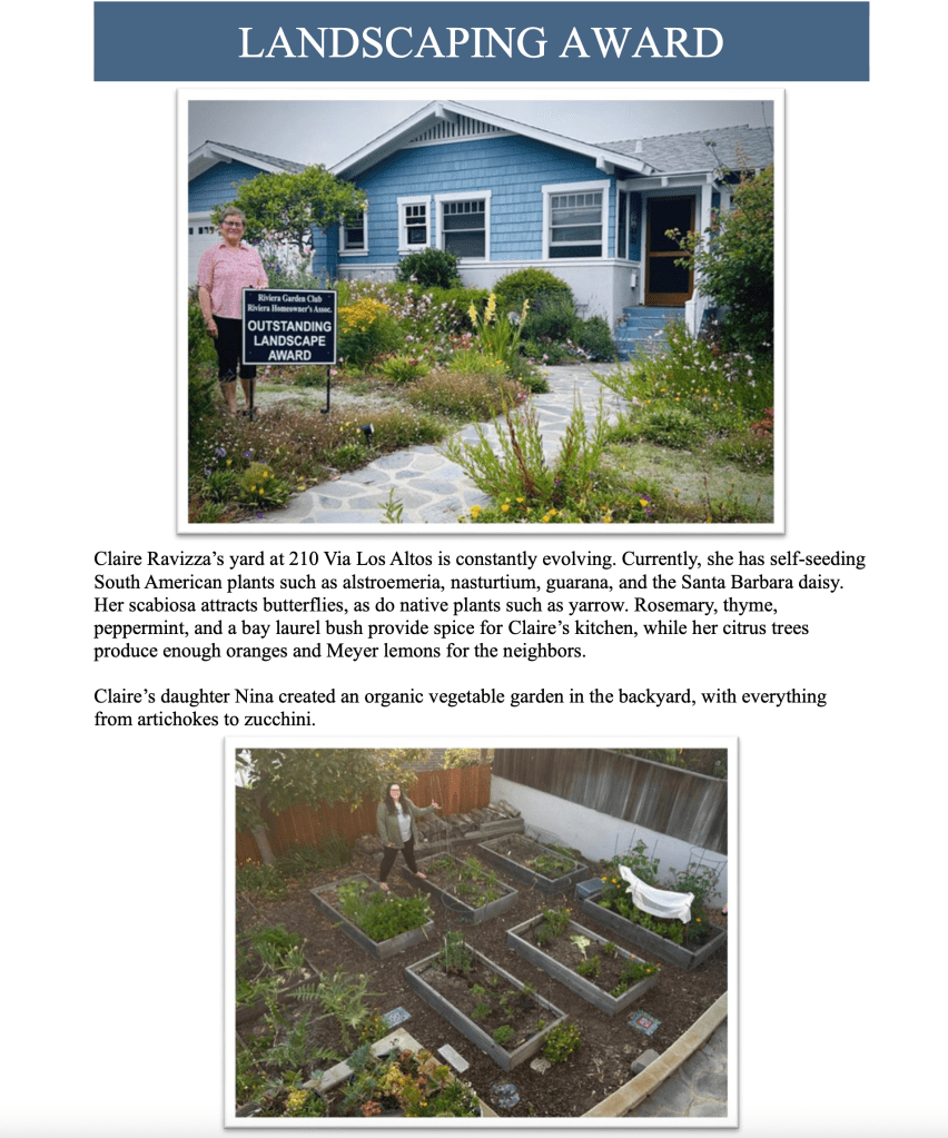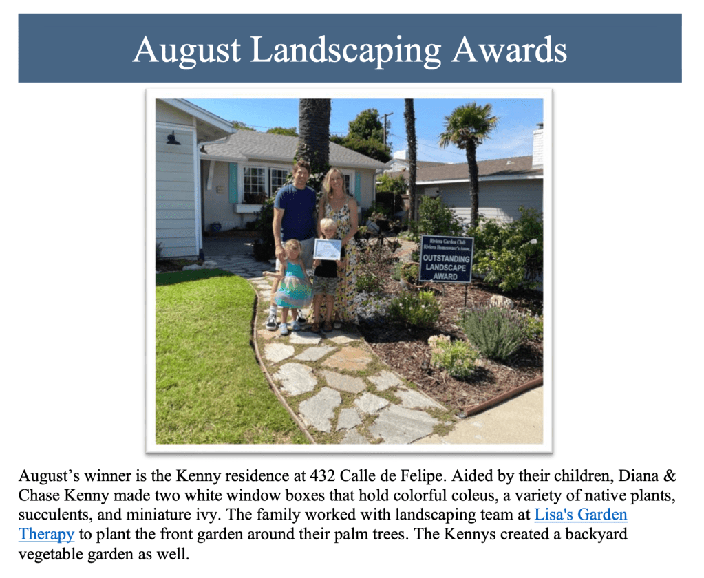 June 2023 – The Delange residence – 802 Calle Miramar (Pictured: June Okamoto, the landscape designer)February 2023 – The Casillas residence – 4134 Paseo de las TortugasDecember 2022 – The Danis residence – 170 Monte d’OroOctober 2022 – The Hart residence – 225 Paseo de GraciaJuly 2022 – The Frieden residence – 109 Via ColusaApril 2022 – The Talbot residence – 533 Paseo de las EstrellasFebruary 2022 – The Gross residence – 125 Calle de ArbolesDecember 2021 – The Lent/Mykola residence – 162 Via Monte d OroSeptember 2021 – The Permann residence – 4305 Highgrove AveMay 2021- The Hilton/Zilm residence- 732 Calle de ArbolesFebruary 2021 – The Moore residence – 358 Camino de las Colinas November 2020 – The Kaiser residence – 500 Calle de ArbolesSeptember 2020 – The Heater residence – 642 Paseo de la PlayaAugust 2020 – The Wolf residence – 209 Via ColusaJune 2020 – The Muller Residence – 5013 Paseo de PabloFebruary 2020 – The Clow / Smith-Arizmendi residence – 416 Avenida de JoseDecember 2019 – The Spisak residence – 242 Paseo de las DeliciasOctober 2019 – The Ward residence3837 Paseo de las TortugasAugust 2019 – The Feicht residence – 439 Camino De EncantoJune 2019 – the Azizian residence – 4539 NewtonMay 2019 – the Youngdale residence – 232 Via Los MiradoresFebruary 2019 – the Jones residence – 375 Camino de las ColinasNovember 2018 – the Gustafson residence – 266 Via Buena VenturaSeptember 2018 – the Ramirez residence – 300 Pacific Coast Highway